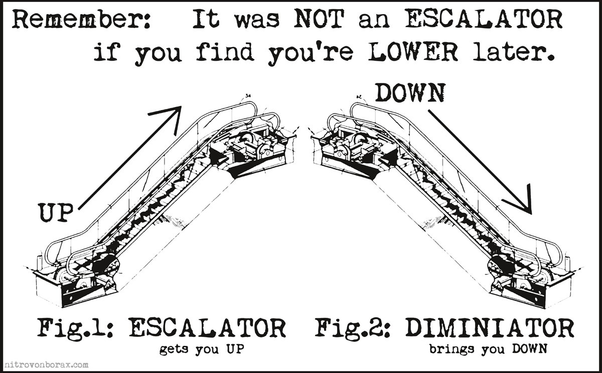 So, it’s not an ESCALATOR if you’re going DOWN, is it? And everybody just goes around blithely saying, like, “oh, just take the escalator down to the mezzanine level,” like that makes any sense whatsoever.