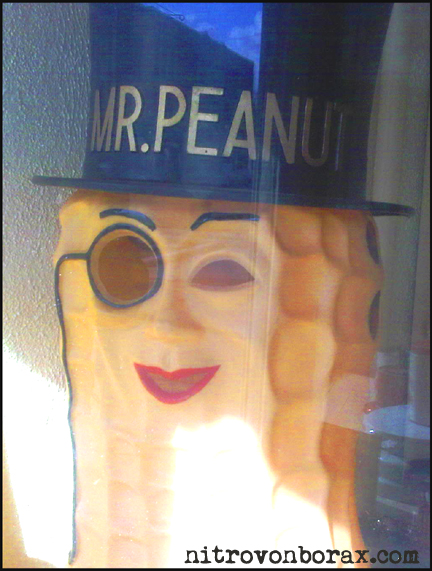 …I took this picture of a life-size Mr. Peanut Costume in an antique shop window in Depot Town, Ypsilanti; the hollow eyes mutely attest to the moral vacuity of a nut that desires nothing so much as it’s own gormandization…