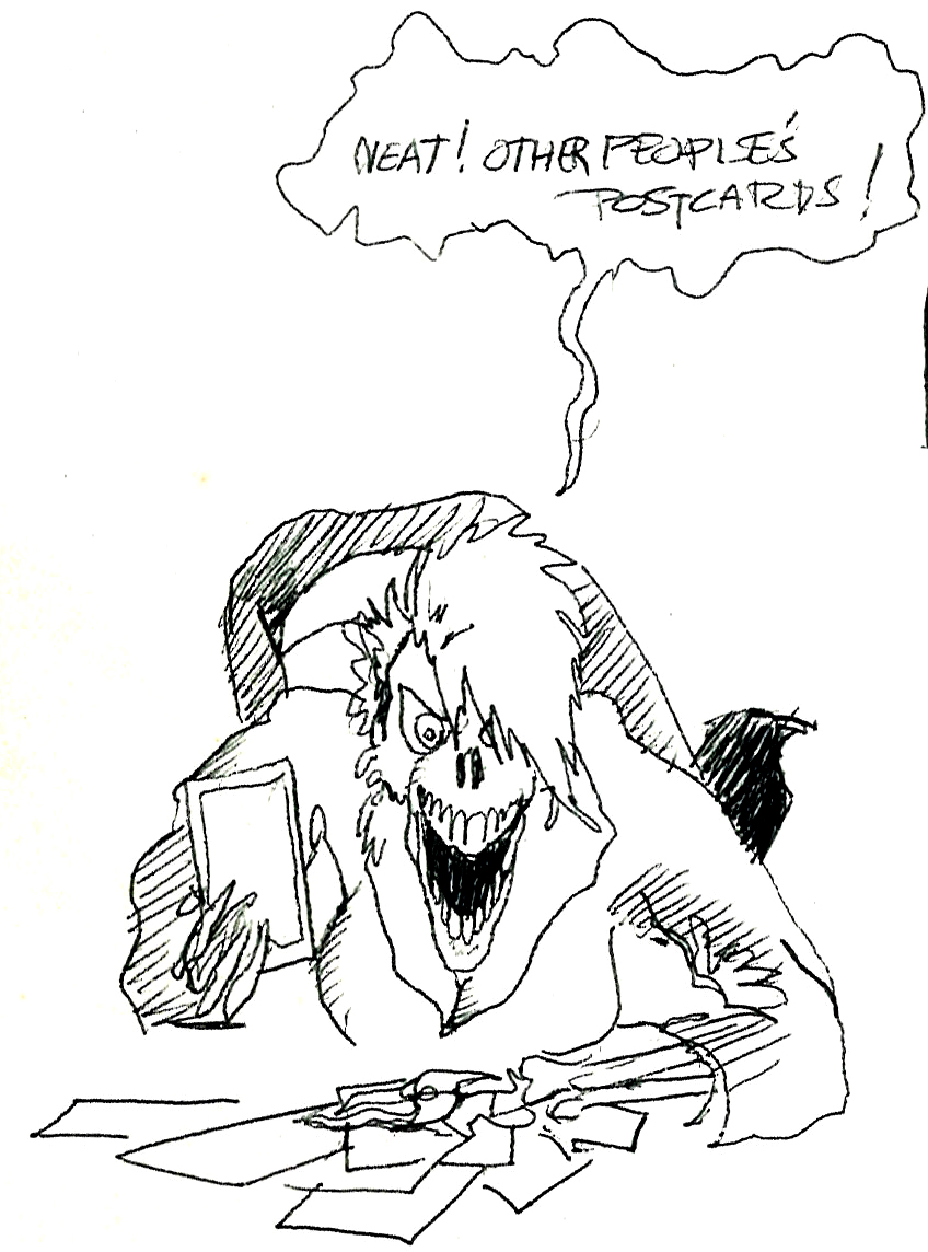 When we lived together in the Wobbly House Anarcho-Collective, where the dryer contained broken glass and a bowling ball, and there were bands in the basement and every night was REALLY LOUD and the landlord had quite a lot to say about us to Jim’s parents at the end of it all, and Greg and I worked together at Vicious Corner, insulting frat boys and listening to the Sisters of Mercy and Husker Du while stocking the cooler, I was always finding some brilliantly altered mass-media or original sketches littering the carpet or left unmentioned in my sketchbooks.