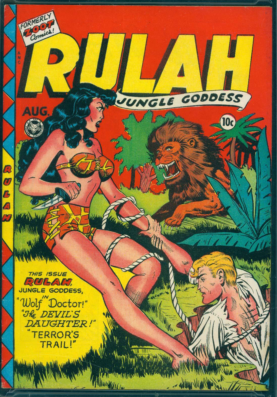 Acrylic paint on textured paper on ripped up old comic books. Trying to channel the old 1950’s Jungle Girl comic artists that didn’t have easy reference material that allows one to draw realistic animals, and so they end up looking like some kind of hamhanded medieval monster, like the below RULAH: