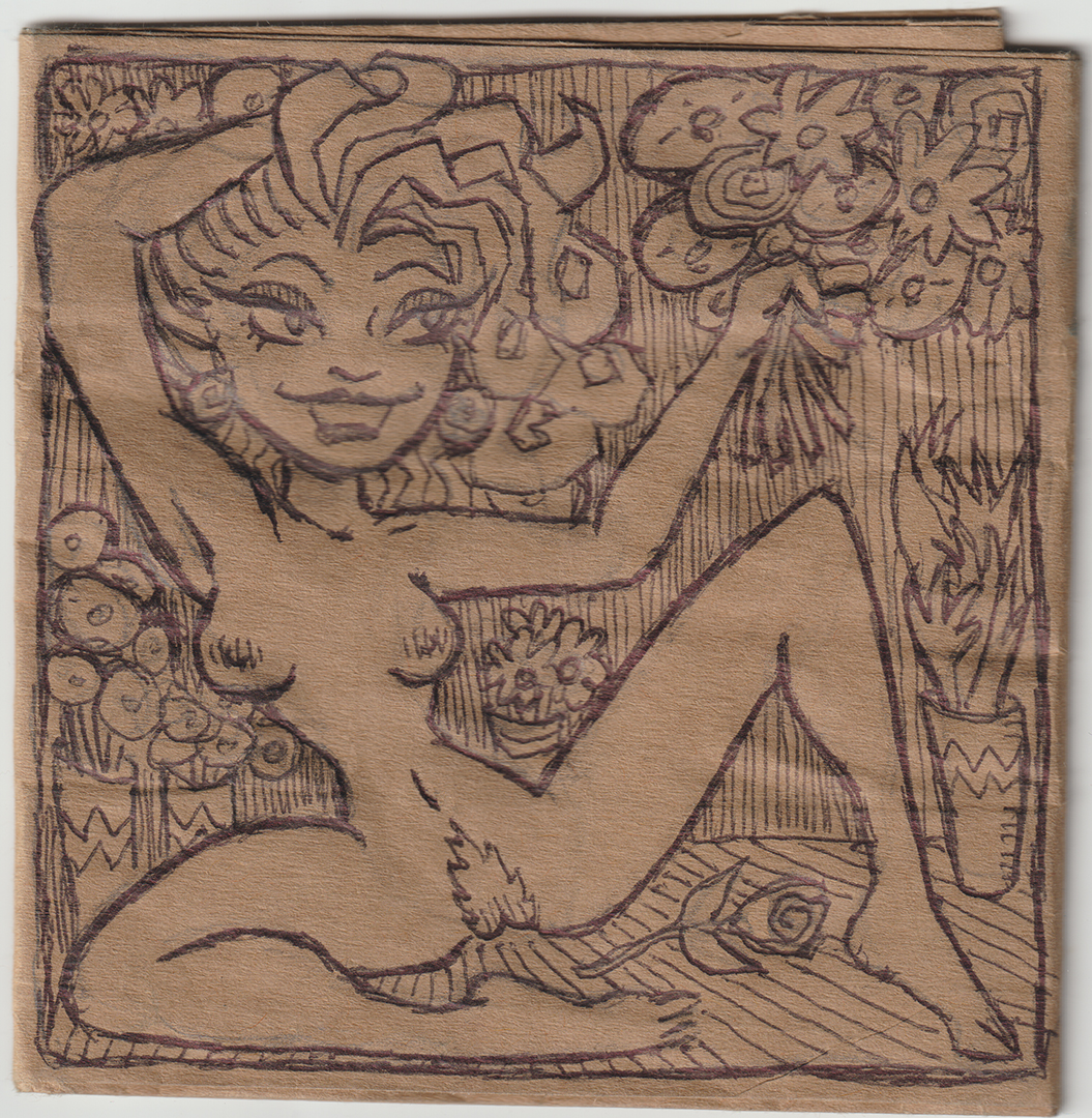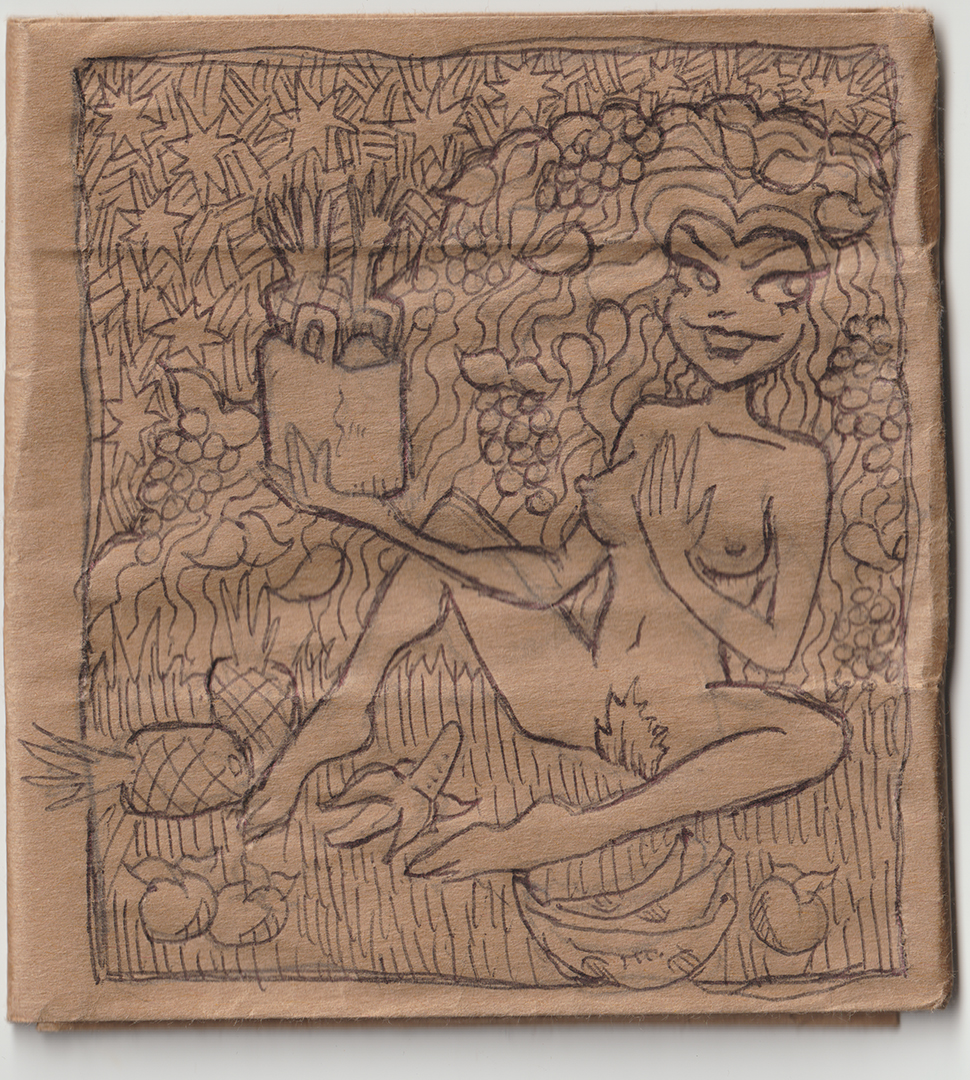 There was little to do many nights while I stood at the front enforcing mask use and sterilizing surfaces for the terrified old rich people who braved the experience for essential arugula and Cabernets. I would fold a quart liquor bag in 4 and use the terrible failing ballpoint pens I was supposed to be working with to draw 12 nudes, each in a different department of the grocery store. IDK.