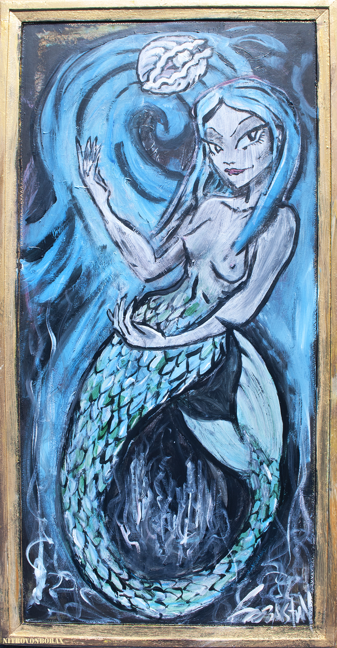 Oh, and this is brand new, on a coffee table top I found. All I had to do was saw off the legs and add gold paint & Mermaid, for voilà this decorative wall art, suitable for pirate taverns, nautical bordellos, etc. Approx 20″ X 40″